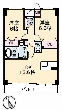 | 間取り | 2LDK(洋室6帖 洋室6.5帖 LDK13.6帖) | ||